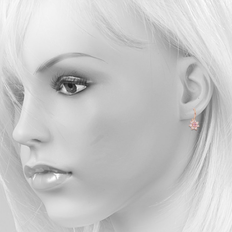 Серьги золотые с цирконами. Серьги выполнены из красного русского золота 585° с бесцветными и розовыми цирконами алмазной огранки, являющимися идеальной имитацией бриллианта. Эти миниатюрные серьги порадуют Вас своей простотой и изяществом.
