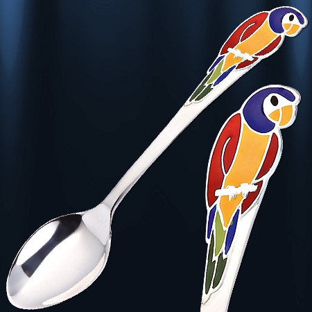 Детская ложка на зубок из серебра 925 пробы с фигуркой попугая, окрашенной горячей эмалью (цвет эмали может быть различным).