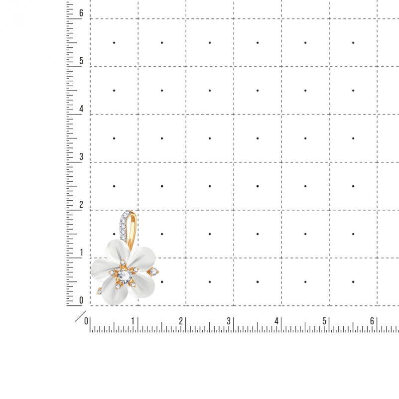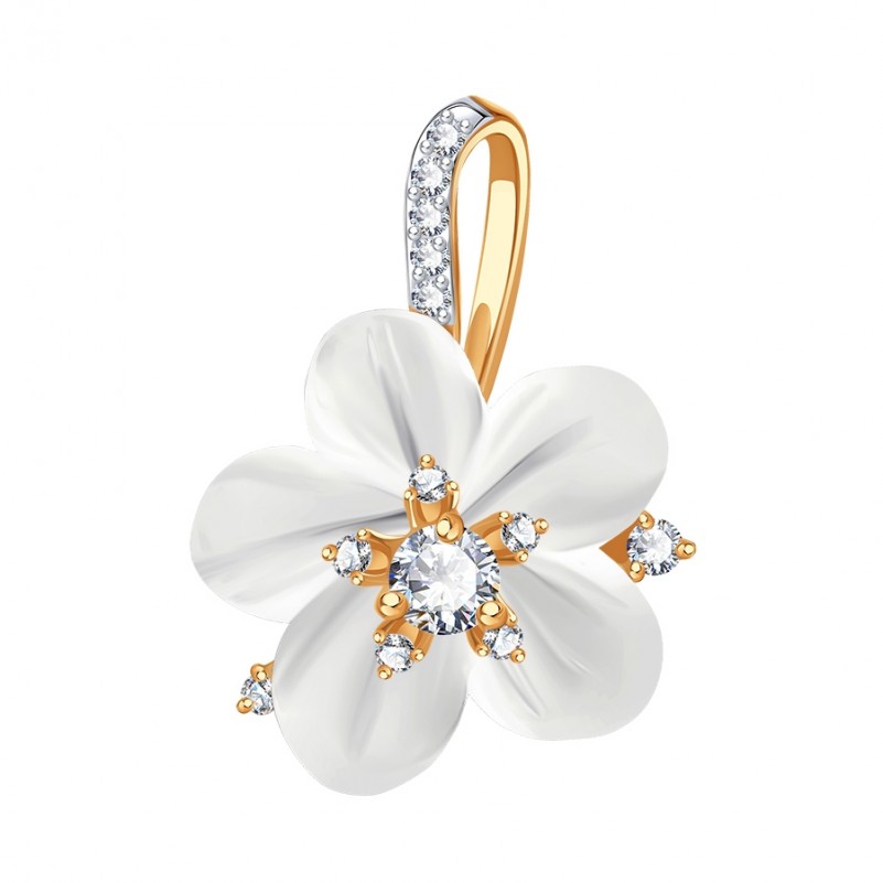 Кулон выполнен из русского красного и белого золота 585°. Цветок выполнен из перламутра ¢ 15 мм и украшен фианитом ¢ 3 мм, ¢ 2 мм и ¢ 1 мм.
