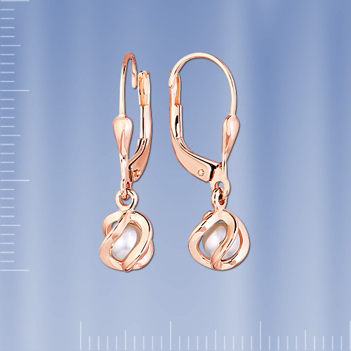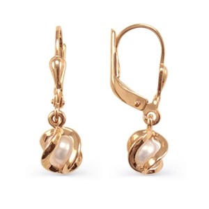 Серьги- подвески выполнены из красного русского золота. Вставки: жемчуг ¢ 4 мм. Серьги с английским замком - надежным и долговечным. Золото 585 пробы. Высота пр.25 мм., ширина пр.7 мм.