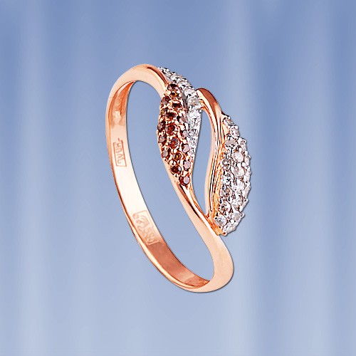 Оригинальное колечко выполненное из красного русского золота 585 пробы и усыпано сверкающими белыми и коньячными бриллиантами.