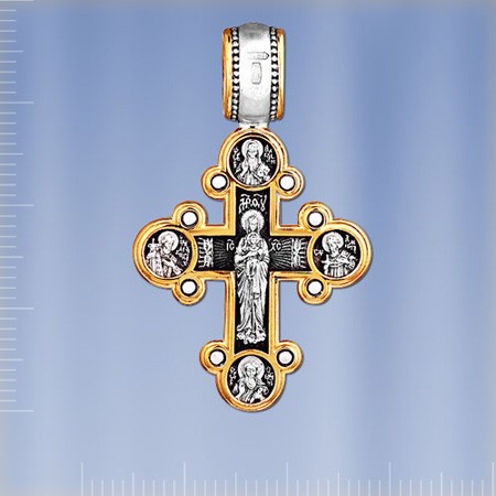 Православный крест Распятие Христово. Деисус. Валаамская икона Божией Матери. Русские святые из чернённого серебра 925 пробы позолоченный 999 пробы. Высота с ушком пр.36 мм., ширина пр.23 мм., толщина пр. 2 мм. Размеры ушка под цепочку пр.6 х 4 мм