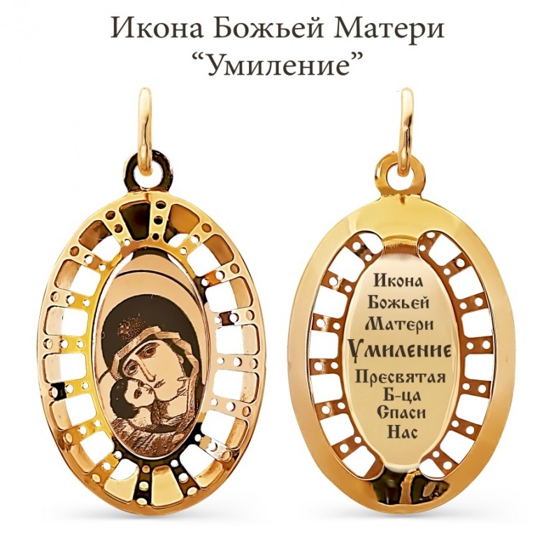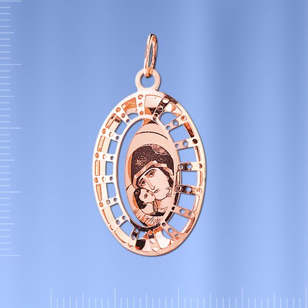 Образок нательный с изображением Божией Матери с Младенцем Иисусом. На ажурном основании с прорезями выгравировано изображение Богородицы. На обратной стороне оброзка надпись" Икона Божьей Матери Умиление Пресвятая Богородица Спаси нас". В верхней части подвески имеется колечко для цепочки.
