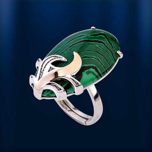 Стильное, изящное кольцо из серебра 875 пробы комбинированное с золотом 375 пробы с крупной вставкой малахита (28.0 х 15.0 мм)