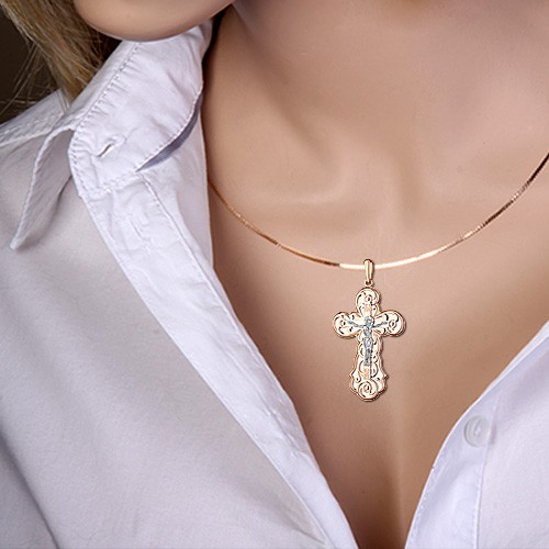Православный золотой крест нательный с распятием. На фигурном основаниии, с алмазной гранью, закреплена отдельно выполненная из белого золота фигурка Иисуса Христа на кресте. В верхней части креста имеется колечко для цепочки. На задней части креста имеется надпись "Спаси и Сохрани". Такой крестик станет шикарным подарком для верующего человека, он не только станет лучшим украшением, которое носят возле сердца, но и надежным защитником!