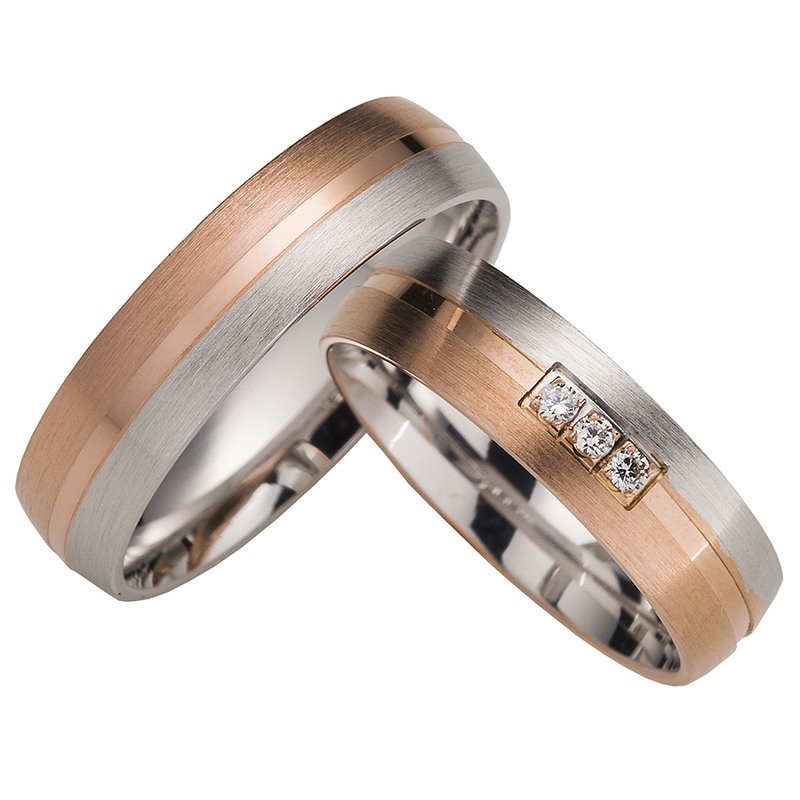 Оригинальное, модное двухцветное обручальное кольцо кольцо из красного и белого золота 585 пробы (матовая и глянцевая текстура) с бриллиантами ( 3 х 0,02 карата, W/SI)