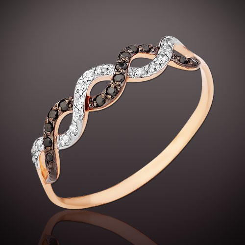 Симпатичное кольцо выполнено из красного русского золота 585 пробы, комбинированного с белым и украшенно фианитами, являющимся идеальной имитацией бриллианта. Особенность этим серьгам придаёт так же частичное чернение деталей, нанесённое на золото с помощью новых технологий. Кольцо прекрасно подчеркнет нежность, очарование и естественность Вашей красоты!