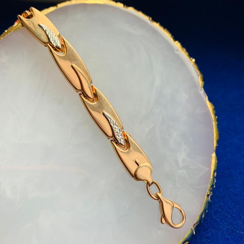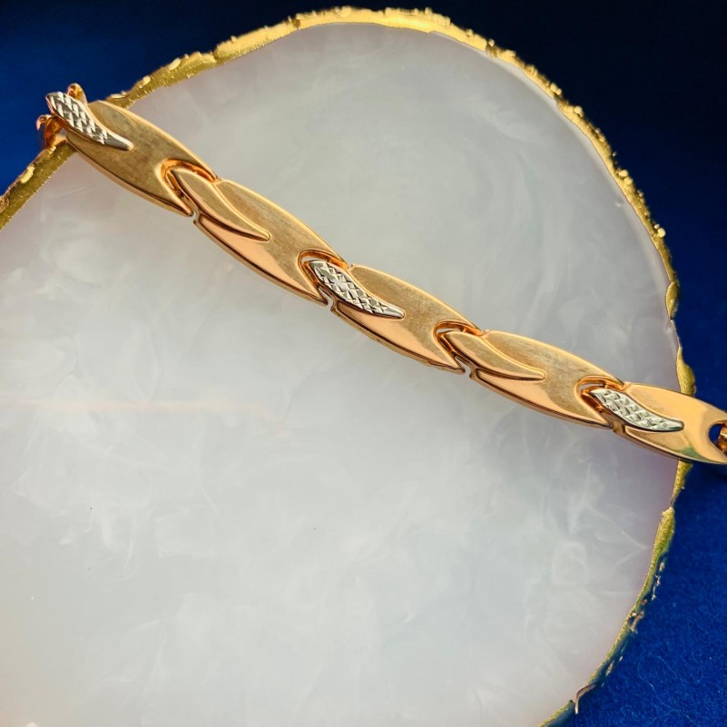 Браслет Золотой с алмазной гранью. Изящный браслет со сверкающей алмазной гранью из белого и красного золота 585-й пробы. Внутренняя часть браслета закрытая, ровная и блестящая. Изящный браслет превосходно украсит как ручку солидной дамы, так и молодой женщины. Браслеты из золота создают необходимый акцент в образе, и привлекают внимание к богатству и роскоши аксессуаров, ведь золото – это красиво, стильно, шикарно, дорого.