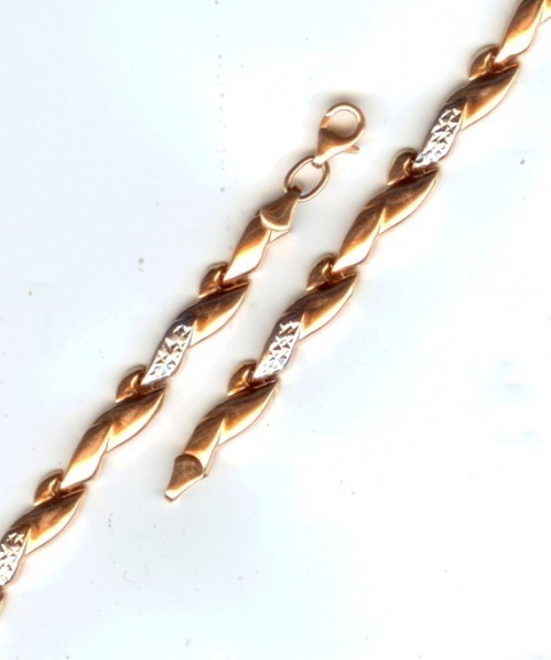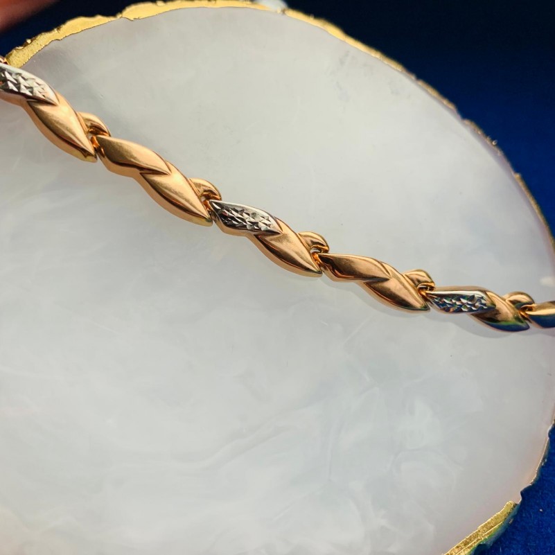 Браслет Золотой с алмазной гранью. Изящный браслет со сверкающей алмазной гранью из белого и красного золота 585-й пробы. Внутренняя часть браслета закрытая, ровная и блестящая. Изящный браслет превосходно украсит как ручку солидной дамы, так и молодой женщины. Браслеты из золота создают необходимый акцент в образе, и привлекают внимание к богатству и роскоши аксессуаров, ведь золото – это красиво, стильно, шикарно, дорого.