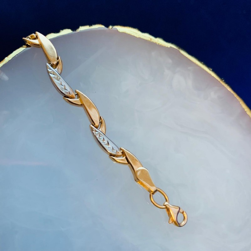 Браслет Золотой с алмазной гранью. Изящный браслет со сверкающей алмазной гранью из белого и красного золота 585-й пробы, изготовлен с использованием особых передовых технологий, что позволяет при видимости объема достичь относительно малого веса, а значит и сопоставимо малую стоимость. Внутренняя часть браслета закрытая, ровная и блестящая. Изящный браслет превосходно украсит как ручку солидной дамы, так и молодой женщины. Браслеты из золота создают необходимый акцент в образе, и привлекают внимание к богатству и роскоши аксессуаров, ведь золото – это красиво, стильно, шикарно, дорого.
