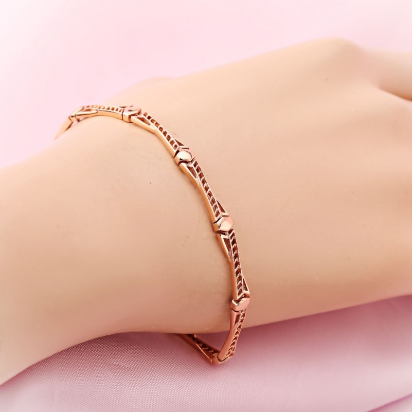 Браслет из русского золота 585. Изящный браслет из красного золота 585-й пробы превосходно украсит как ручку солидной дамы, так и молодой женщины. Браслеты из золота создают необходимый акцент в образе, и привлекают внимание к богатству и роскоши аксессуаров, ведь золото – это красиво, стильно, шикарно, дорого.