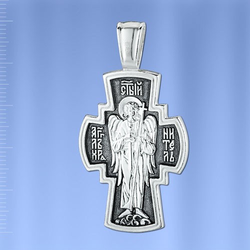 Крест (литье) с рельефным рисунком с обеих сторон. Ангел-Хранитель - добрый дух, данный человеку Богом при крещении для помощи и руководства. Ангел-хранитель невидимо находится при человеке на протяжении всей его жизни. Задача ангела-хранителя — способствовать спасению подопечного, духовно наставлять в вере и благочестии, охранять, заступаться за душу и тело в течение земной жизни. Серебро 925°черненое