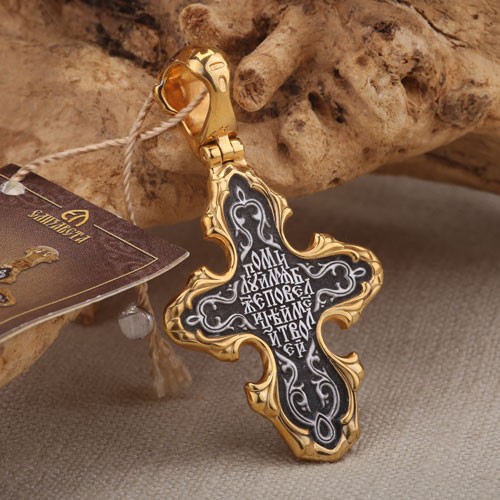 Господь Вседержитель. Деисус. Ангел-Хранитель. Православный крест из чернёного серебра 925 пробы, позолоченный 999 проба. Литьё. Ручная работа