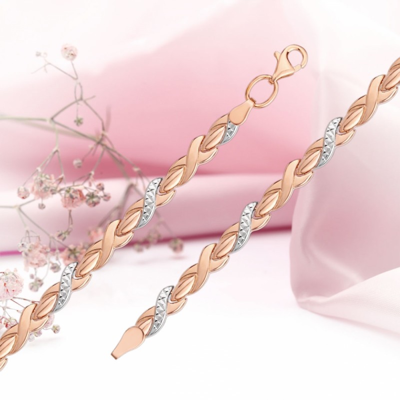 Браслет из русского золота 585 Алмазная грань. Изящный браслет со сверкающей алмазной гранью из белого и красного золота 585-й пробы. Внутренняя часть браслета закрытая, ровная и блестящая. Браслет превосходно украсит как ручку солидной дамы, так и молодой женщины. Браслеты из золота создают необходимый акцент в образе, и привлекают внимание к богатству и роскоши аксессуаров, ведь золото – это красиво, стильно, шикарно, дорого. Данное изделие подчеркнёт Вашу высокую утонченность и глубокое чувство стиля.