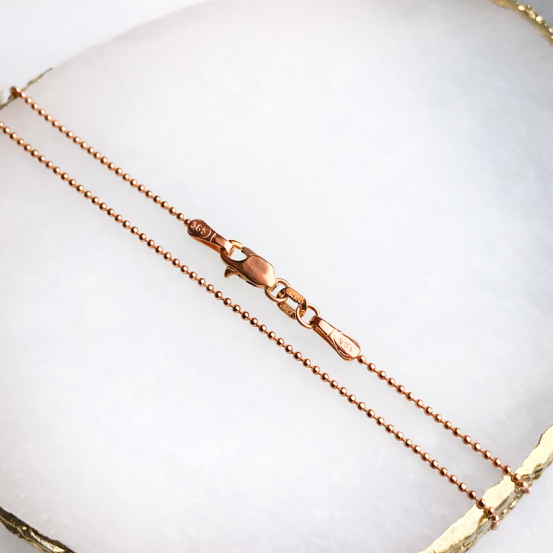 Гранёные шарики красиво отражают свет, создавая живую игру бликов и подчёркивая тёплый оттенок красного золота. Цепочка выглядит аккуратно и женственно, оставаясь универсальным украшением для повседневных и романтичных образов.