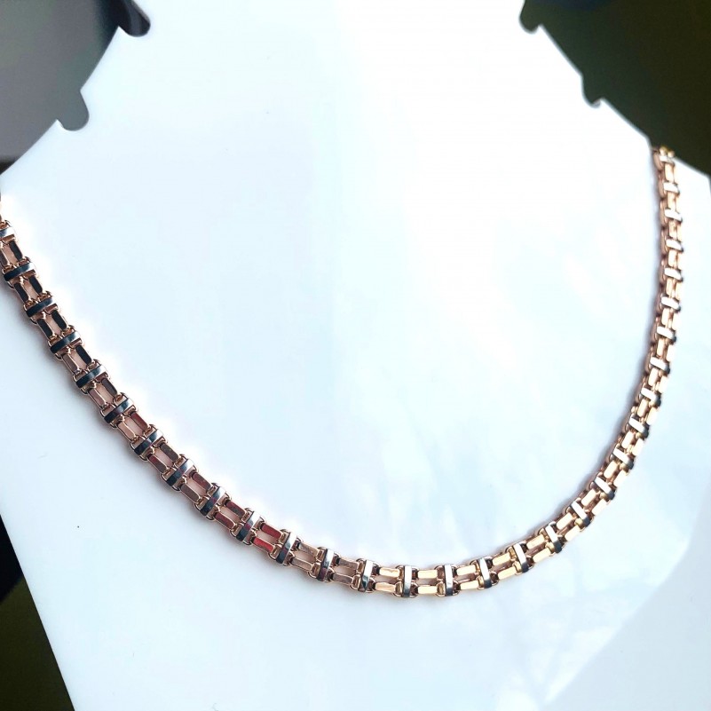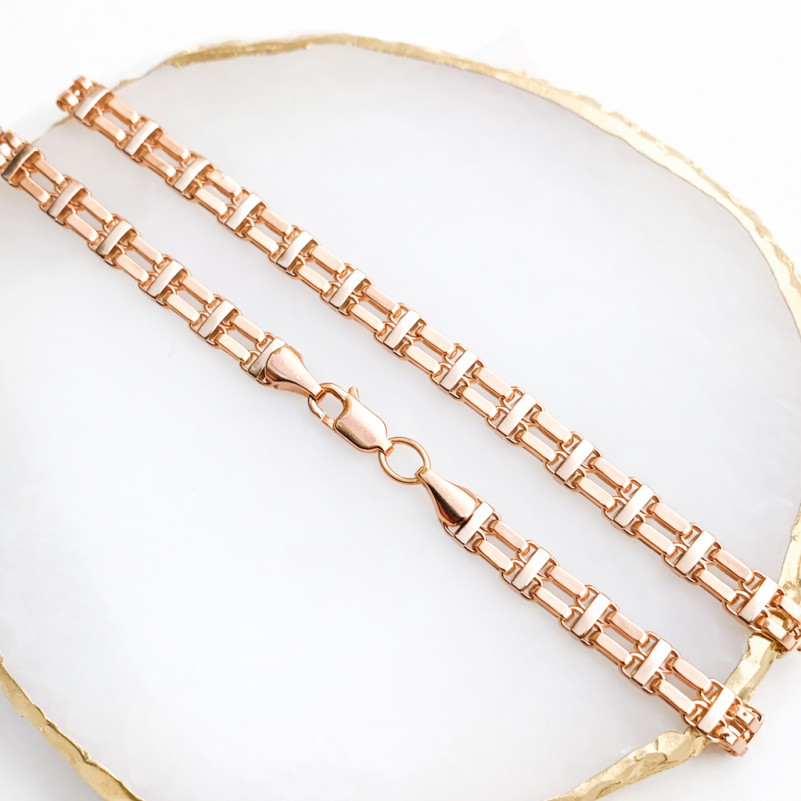 Эта эффектная цепочка выполнена в благородном сочетании красного и белого золота 585 пробы и привлекает внимание выразительным двойным якорным плетением. Чёткая геометрия и контраст оттенков золота формируют современный, архитектурный образ.