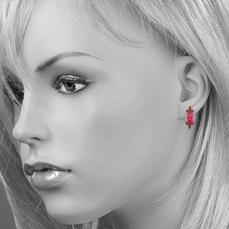 Очаровательные серьги из серебра 925 пробы с фианитами и рубинами. Серьги покрыты родием и твёрдой позолотой.