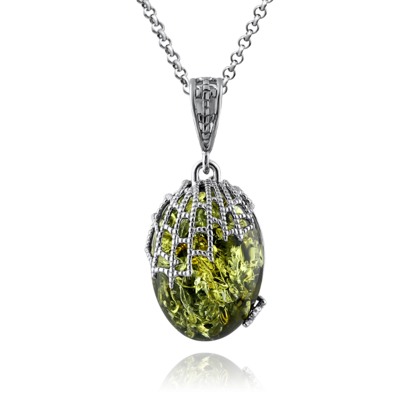 Очаровательная подвеска из серебра 925 пробы с родированным покрытием и уникальным зелёным янтарём, с этим удивительным «кусочком солнца», играющим всеми оттенками зелёного цвета.