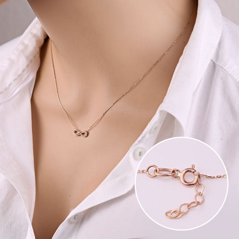 Нежное и романтичное колье из красного золота 585 пробы, украшенное вставкой сверкающего циркония. Цепь - якорное плетение с алмазной огранкой.