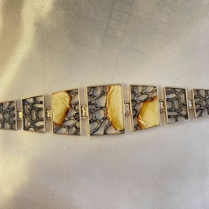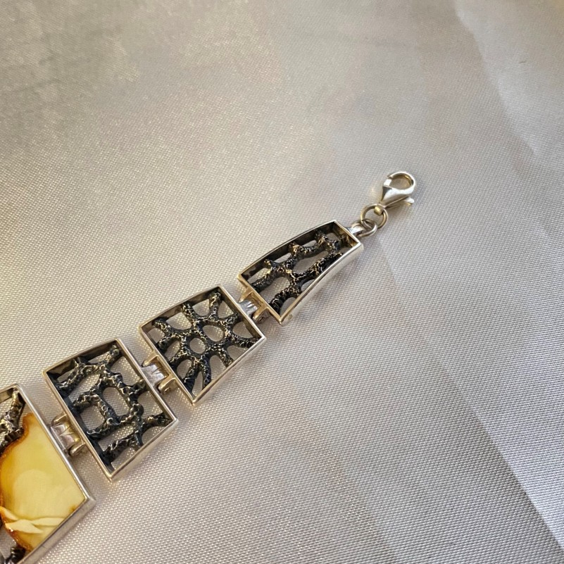 Оригинальный браслет из чернёного серебра 925 пробы со вставками крупного янтаря, этого удивительного «кусочка солнца» и украшеного филигранью. Уникальная возможность подчеркнуть свою индивидуальность, придать образу женственности и нежности!
