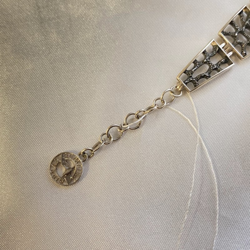 Сам браслет выполнен из скреплённых между собой серебряных пластинок, украшенных филигранью.