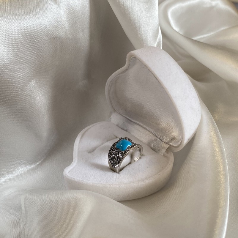 Оригинальное кольцо из чернёного серебра 925 пробы со вставками глубокого марказита и бирюзы. Такое кольцо подчеркнёт утончённость вкуса и изящество рук.
