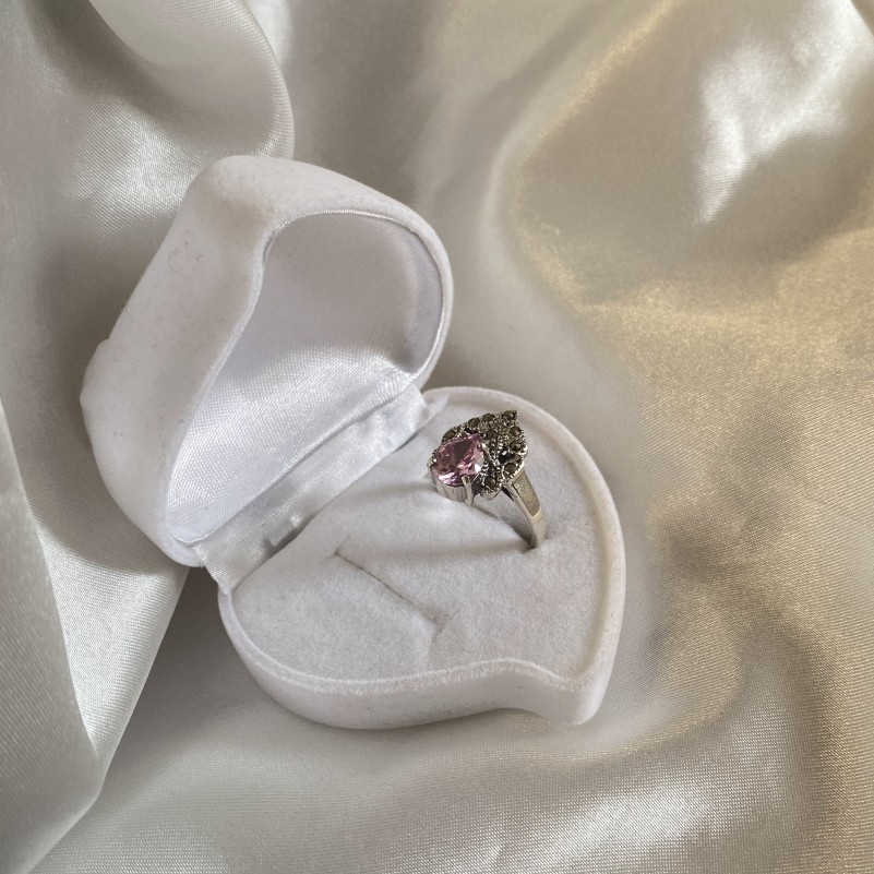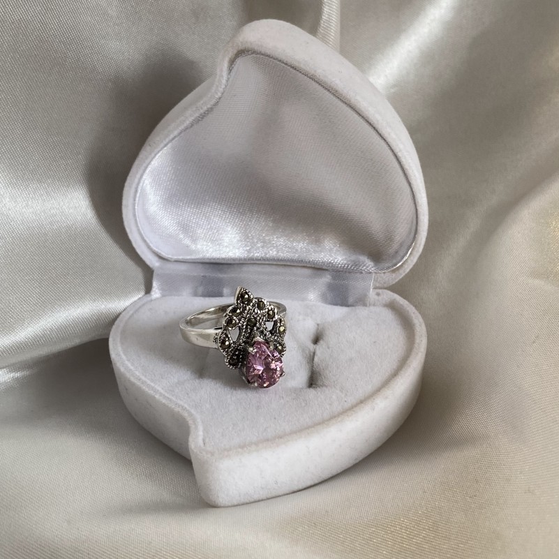 Оригинальное кольцо из чернёного серебра 925 пробы со вставками глубокого марказита и розового фианита. Такое кольцо подчеркнёт утончённость вкуса и изящество рук.