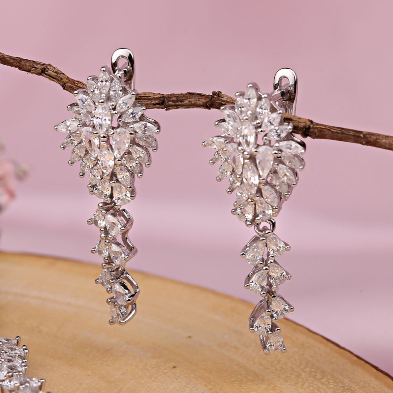 Восхитительный гарнитур из серебра 925 пробы со вставками сверкающих фианитов! Комбинация этих очаровательных камней разных размеров и формы придаёт изделию неповторимый вид и пленяет глаз. Такой гарнитур подчеркнёт нежность, женственность и очарование своей хозяйки! Цепочка якорного плетения с алмазной огранкой.