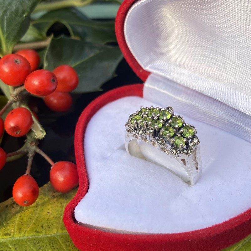 Оригинальное кольцо из чернёного серебра 925 пробы со вставками глубокого марказита и зелёного фианита. Такое кольцо — это удивительное сочетание элегантности, легкости и индивидуальности наполняет украшение особенным шармом и вдохновением.