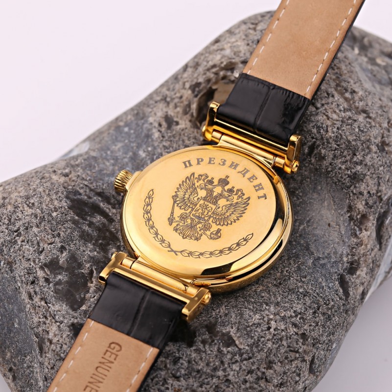 Мужские механические часы с календарём. Корпус из позолоченной стали, циферблат чёрный. Часы механические с ручным заводом, с центральной секундной стрелкой и календарём числа месяца. Механизм с противоударным устройством оси баланса. Количество рубиновых камней - 17. Ремень из натуральной кожи.