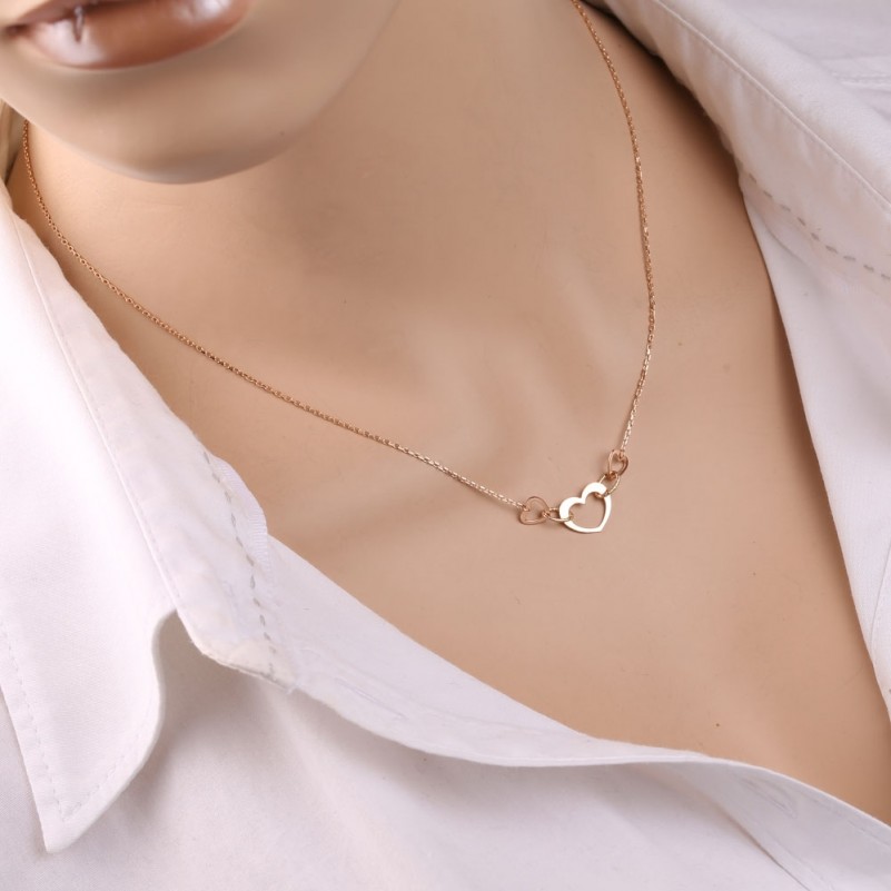 Нежное и романтичное колье из красного золота 585 пробы, украшенного подвеской из сердец с зеркальной поверхностью. Цепь - якорное плетение с алмазной огранкой.