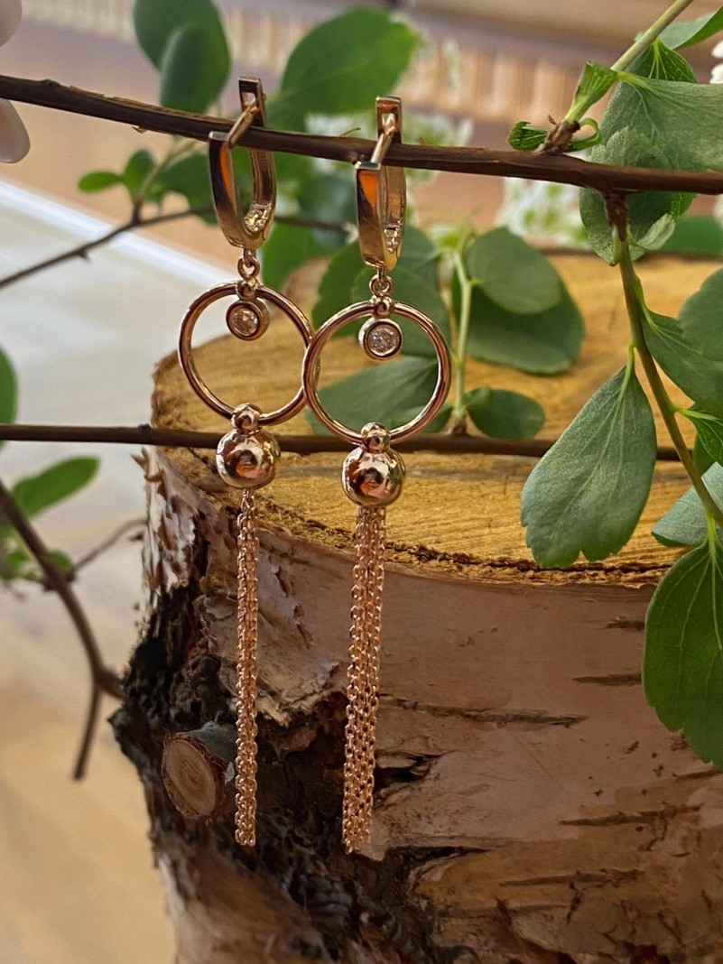 Золотые серьги-подвески из красного золота 585 пробы в Германии. Женственные, изящные серьги-подвески из красного золота, украшенные подвесками из цепочек якорного плетения и сверкающими фианитами. Подчеркнёт вашу элегантность и женственность, приковывая восхищённые взгляды.