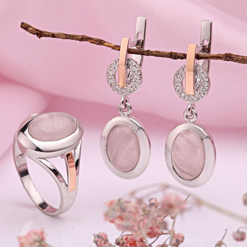 Серебряное кольцо с золотом. Розовый кварц. Нежное и романтичное серебряное кольцо с золотом и вставками очаровательного розового кварца. Серебро 925 пробы и золото 375 пробы. Серебро с золотой вставкой выглядит очень богато и стильно по сравнению с классическим серебром. Его блеск и красота будут прекрасным дополнением к имиджу. Дама с таким украшением будет выглядеть стильно и изыскано.