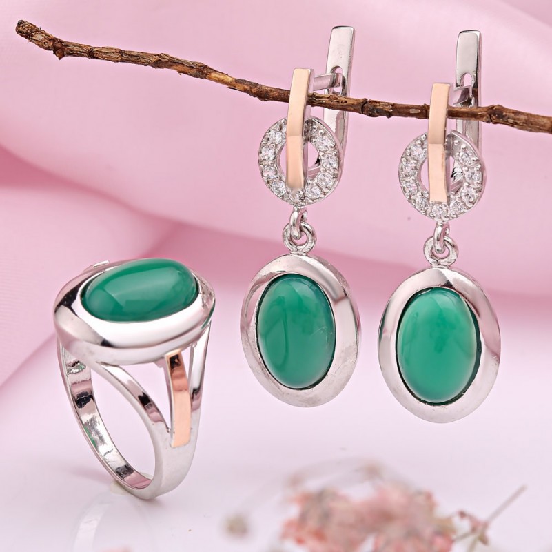 Вставки: фианиты круг Ø 2.0 мм; 2 хризопраз овал 12.0 х 8.0 мм