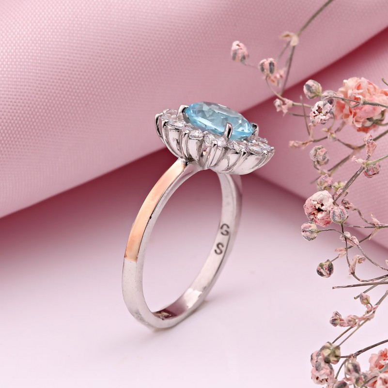 Нежное и романтичное серебряное кольцо с золотом и нежно голубым фианитом в оправе из белых фианитов. Серебро 925 пробы и золото 375 пробы. Серебро с золотой вставкой выглядит очень богато и стильно по сравнению с классическим серебром. Его блеск и красота будут прекрасным дополнением к имиджу. Дама с таким украшением будет выглядеть стильно и изыскано.