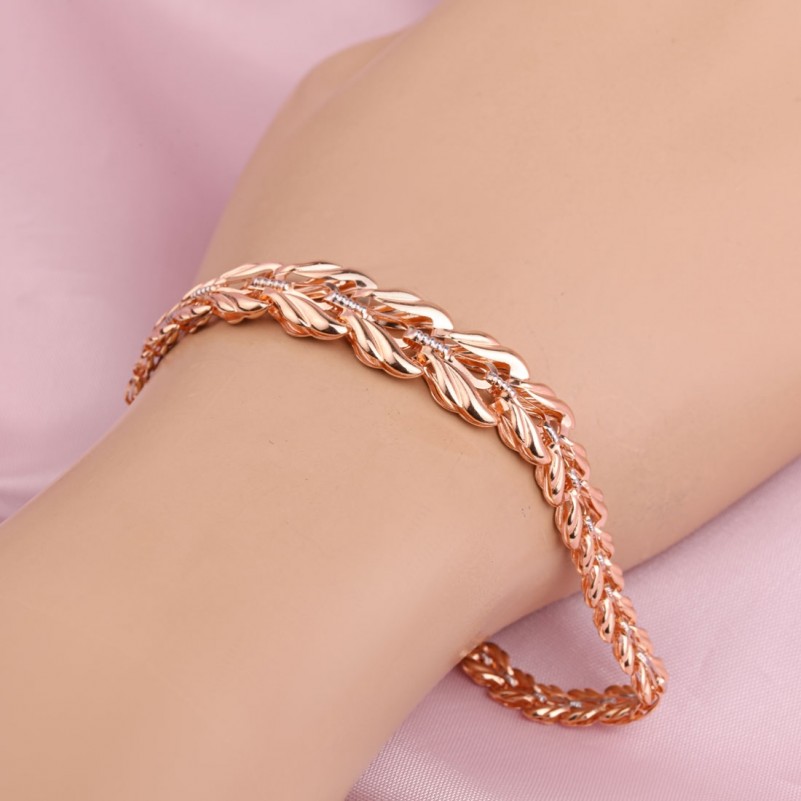 Браслет из красного золота 585 пробы с акцентами из белого золота. Элегантный и женственный браслет из красного и белого золота 585 пробы замечательно украсит изящные женские руки! Каждая стильная женщина и девушка мечтает о таком украшении. Браслет выглядит богато и привлекает восторженные взоры окружающих. Фантазийное плетение!