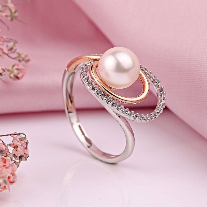 Золотое кольцо из русского золота Жемчуг. Обаятельное и нежное кольцо из белого и красного золота 585 пробы, украшенное очаровательными и сверкающими фианитами и природным, искусственно выращенном, жемчугом, растущим в привычных для себя условиях! Подчеркнёт женственность, изящество и хороший вкус. Отличный подарок для любимого человека!