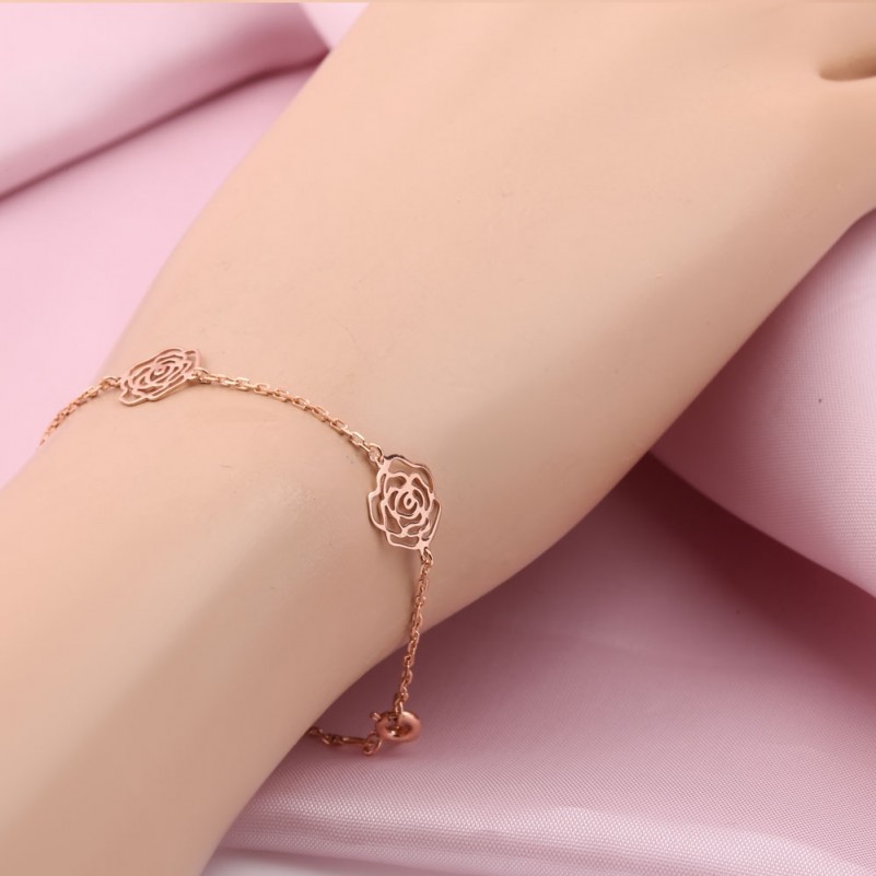 Браслет Русское золото 585. Нежный и романтичный браслет из красного золота 585 пробы, украшенный вставками в виде филигранных роз. Цепь - якорное плетение с алмазной огранкой.