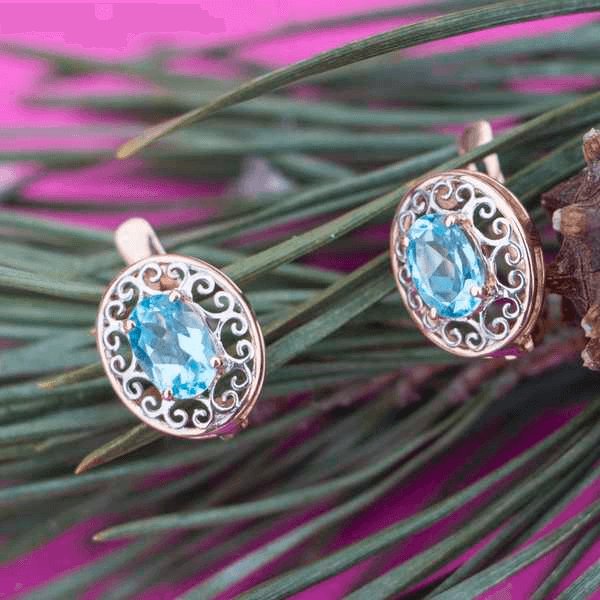 Элегантные серьги из красного золота с голубыми топазами.