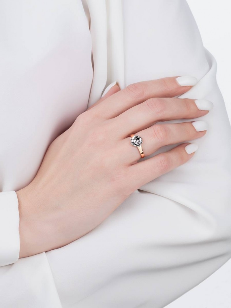 Танцующий бриллиант Золотое кольцо 585. Танцующий бриллиант - кольцо из русского красного золота, комбинированного с белым. Изящное золотое кольцо с бриллиантами и танцующим бриллиантом на фоне из белого золота с алмазной огранкой! Безусловно, каждая женщина мечтает о таком незабываемом и запоминающимся подарке для красивых женских пальчиков, как золотое кольцо с бриллиантом.