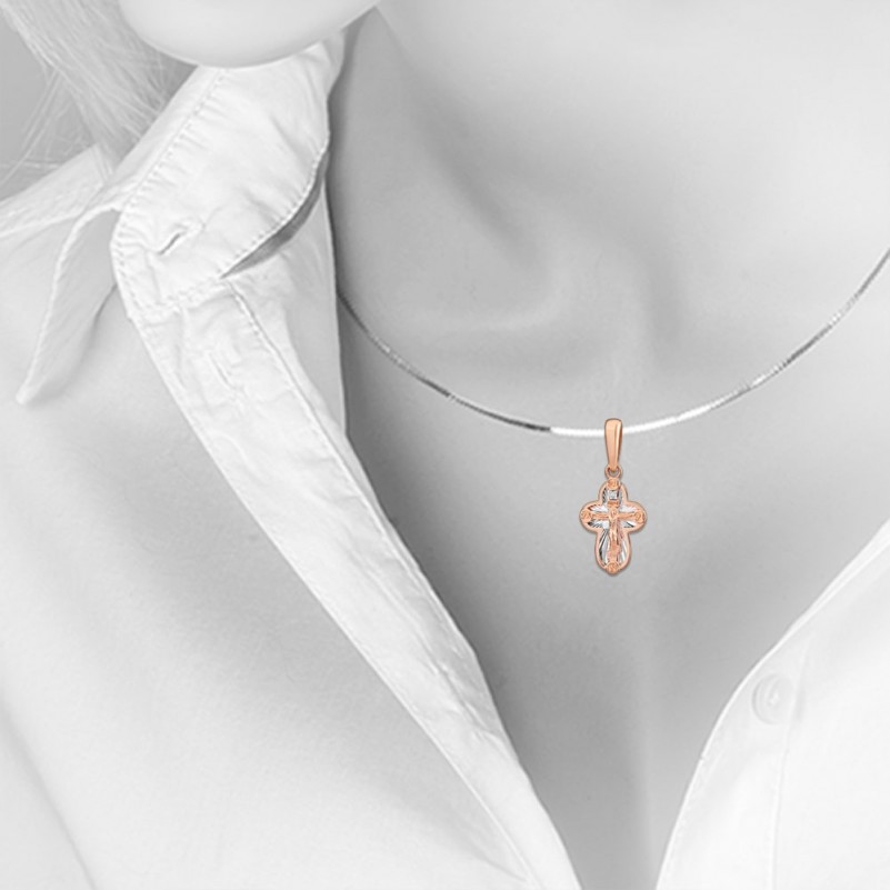 Золотые крестики нательные с распятием ИНЦИ Бриллианты. Золотой крест из русского красного золота 585 пробы, украшенный акцентами из белого золота 585 пробы с алмазной огранкой и вставкой бриллианта. На оборотной части креста имеется молитвенная надпись "Господи Спаси и Сохрани".