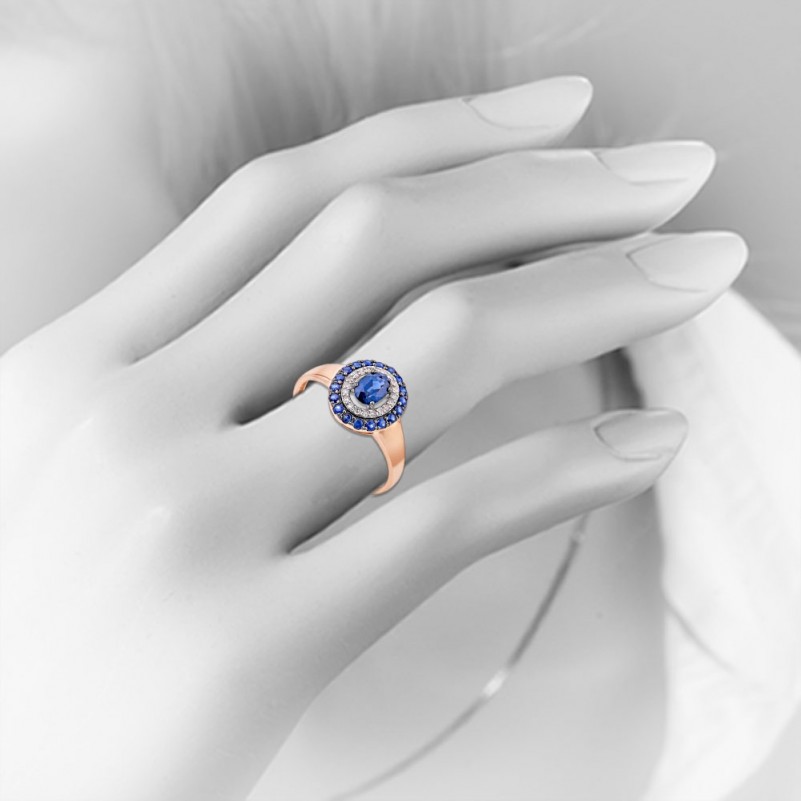 Изящное кольцо из красного золота 585 пробы со вставками очаровательных сверкающих бриллиантов и сапфиров. Красоту бриллиантов превосходно подчёркивают акценты из белого золота, а глубину сапфира - чернение. Украшение с бриллиантом и синим сапфиром — это сочетание изыска, роскоши и элегантности. Синий цвет любят мужчины и женщины, он вызывает чистоту, спокойствие и веселье одновременно. Неудивительно, что изделия с сапфирами пользуются спросом самых знаменитых и успешных людей.