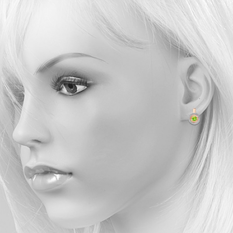 Золотые серьги 585 Танцующий хризолит Фианиты. Восхитительные серьги из красного русского золота 585 пробы со вставками нежного танцующего хризолита и сверкающих фианитов в обрамлении из белого золота 585 пробы. Прекрасный выбор, который подарит хорошее настроение и даст почувствовать себя неотрозимой.