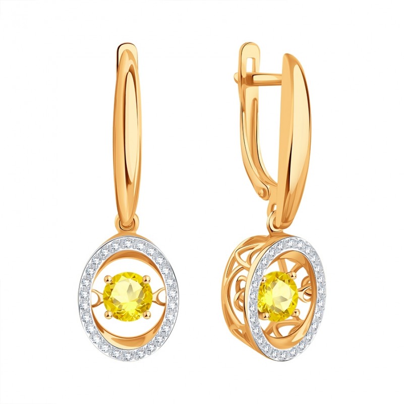 Золотые серьги подвески 585 Танцующий цитрин Фианиты. Восхитительные серьги-подвески из красного русского золота 585 пробы со вставками нежного танцующего цитрина и сверкающих фианитов в обрамлении из белого золота 585 пробы. Прекрасный выбор, который подарит хорошее настроение и даст почувствовать себя неотрозимой.