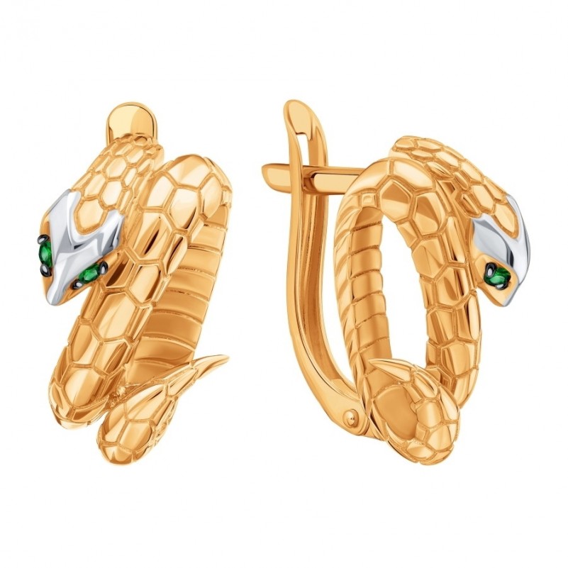 Серьги из красного золота 585 Фианит. Нежные золотые серьги из красного русского золота 585 пробы в виде змеи, украшенные зелёным фианитом и акцентами из белого золота! Чернёное обрамление камней подчёркивает глубину их цвета! От таких серег так и веет шиком и неотразимостью - в них Вы будете привлекательной как в каждодневном, так и в праздничном наряде!