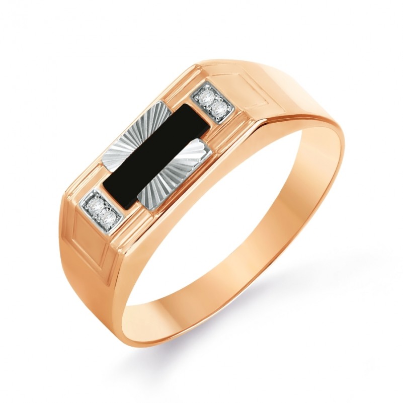 Мужская печатка Русское золото 585 Фианит. Аккуратное и стильное мужское кольцо из красного золота 585 пробы со вставкой очаровательного белого и чёрного фианита с акцентами из белого золота.