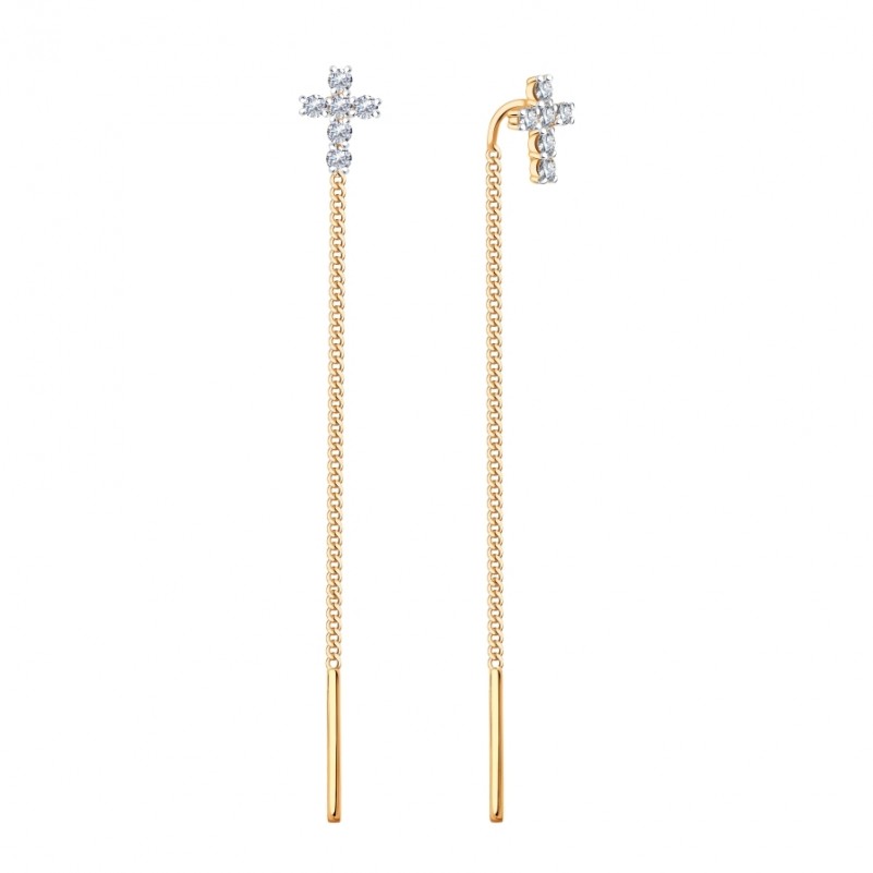Серьги-продевки Протяжки из русского золота 585 Фианит. Серьги - продевки из русского красного золота 585 пробы с цепочкой панцирного плетения. Декоративная часть украшена сверкающими разноцветными фианитами. Серьги все время в движении, смотрятся оригинально и красиво, и превлекают все внимание к ее хозяйке!