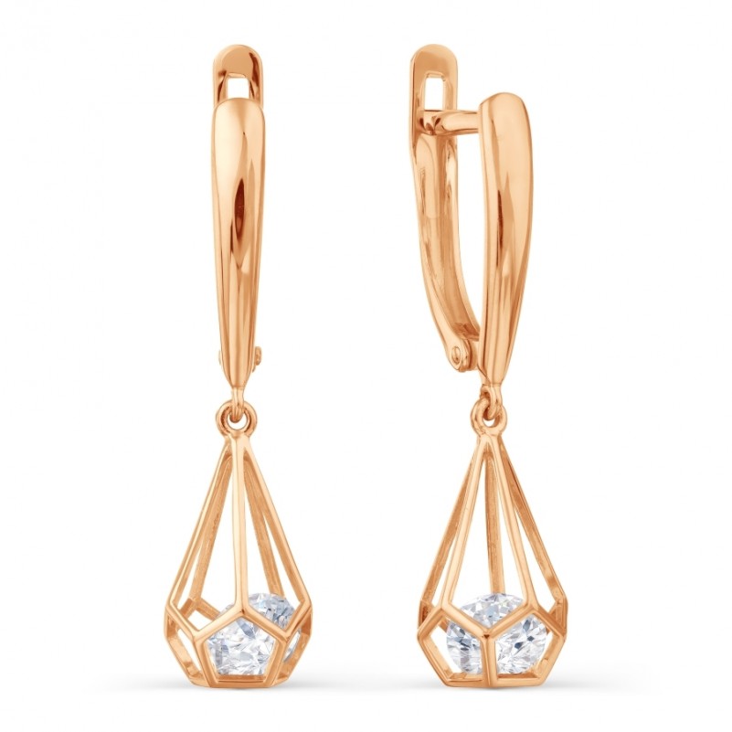 Золотые серьги-подвески из красного золота 585 пробы с фианитами. Женственные, изящные серьги-подвески из красного золота, украшенные сверкающими фианитами. Подчеркнёт вашу элегантность и женственность, приковывая восхищённые взгляды.