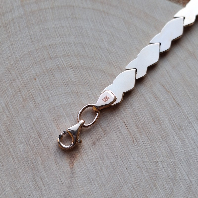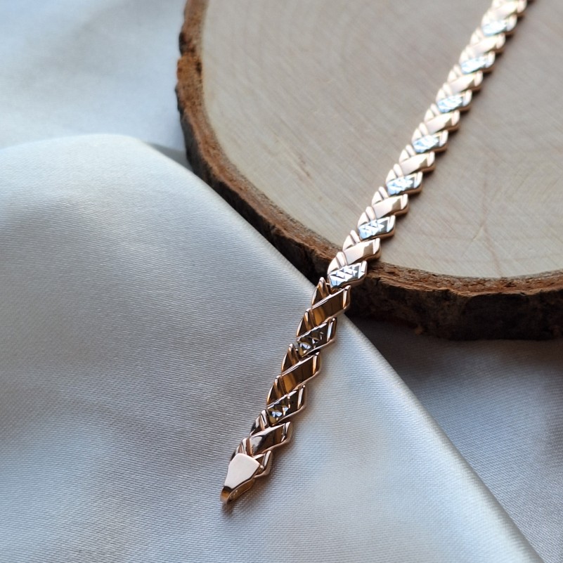 Золотой браслет Русское золото 585 биколор Превосходный браслет выполнен из классического красного золота 585й пробы с акцентами из белого золота с алмазной огранкой. Фантазийное плетение. Прекрасное украшение для Вашего запястья. Данное изделие подчеркнёт утонченность и глубокое чувство стиля!