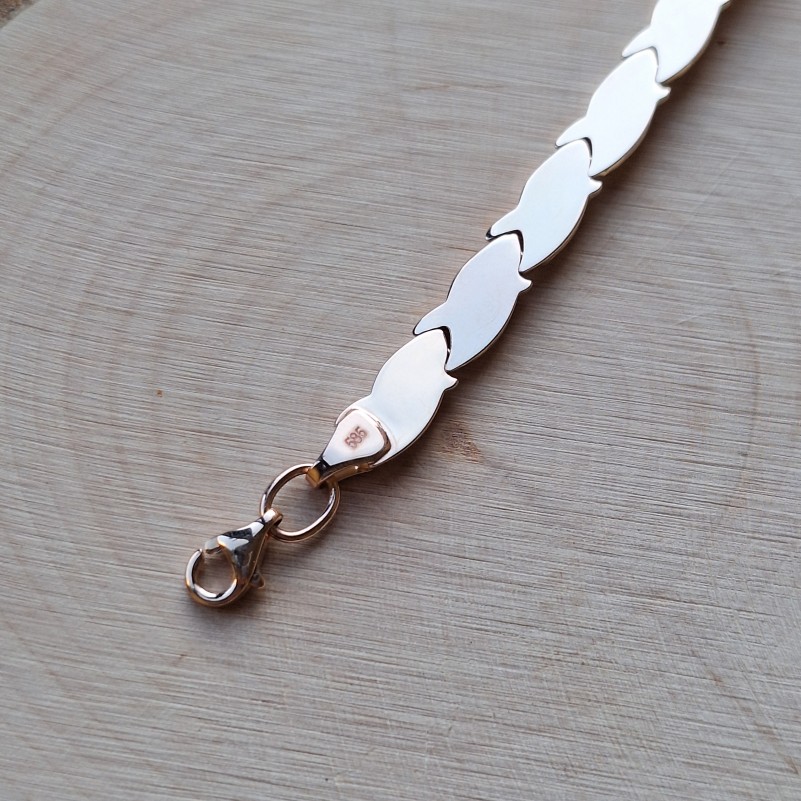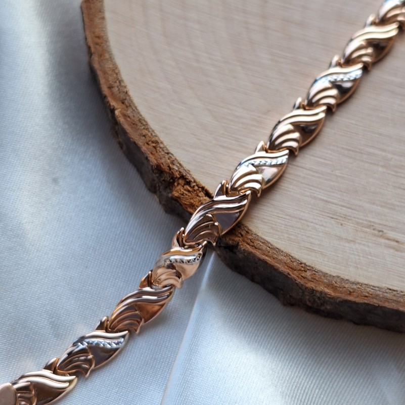 Золотой браслет Русское золото 585 биколор Превосходный браслет выполнен из классического красного золота 585й пробы с акцентами из белого золота с алмазной огранкой. Фантазийное плетение. Прекрасное украшение для Вашего запястья. Данное изделие подчеркнёт утонченность и глубокое чувство стиля!